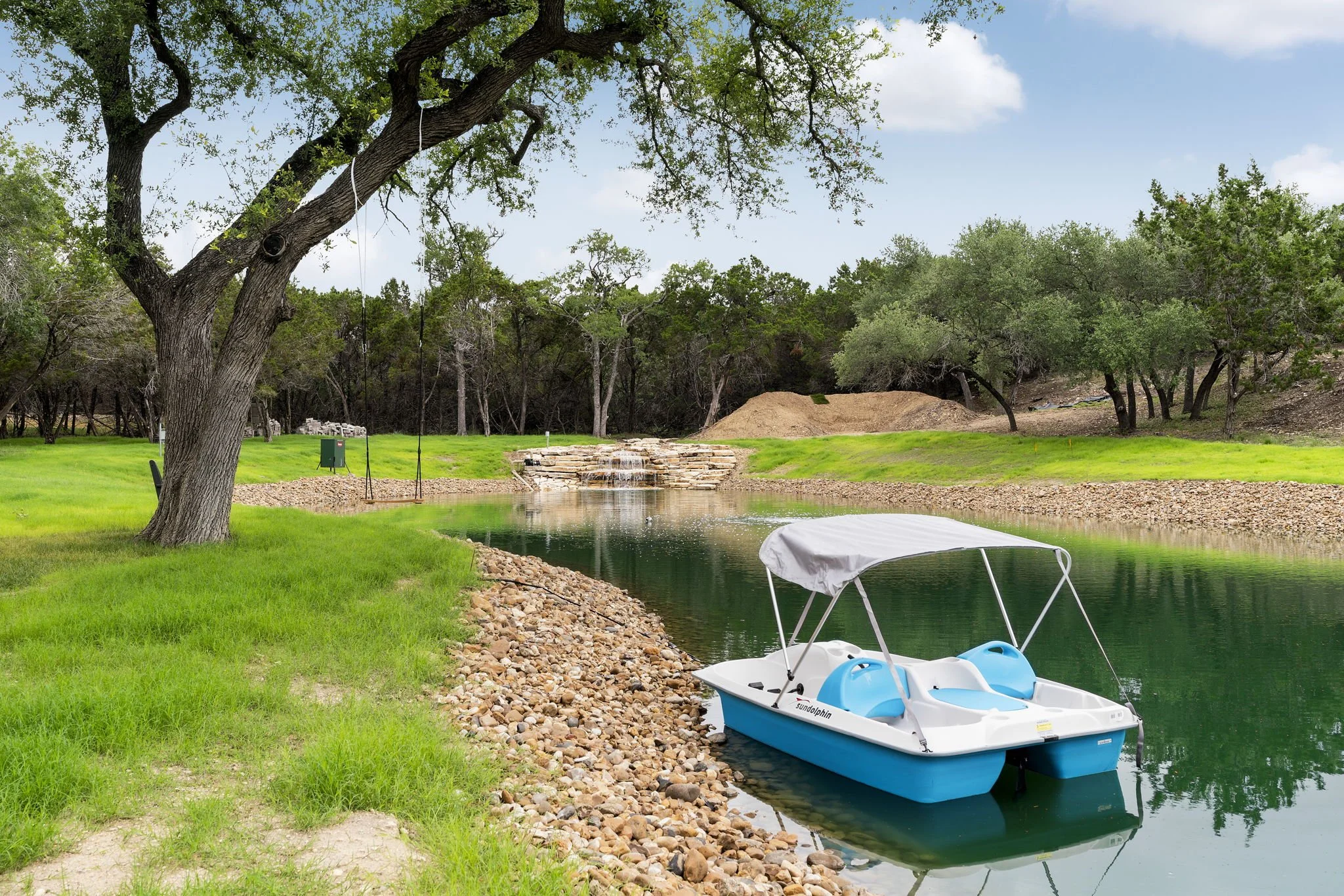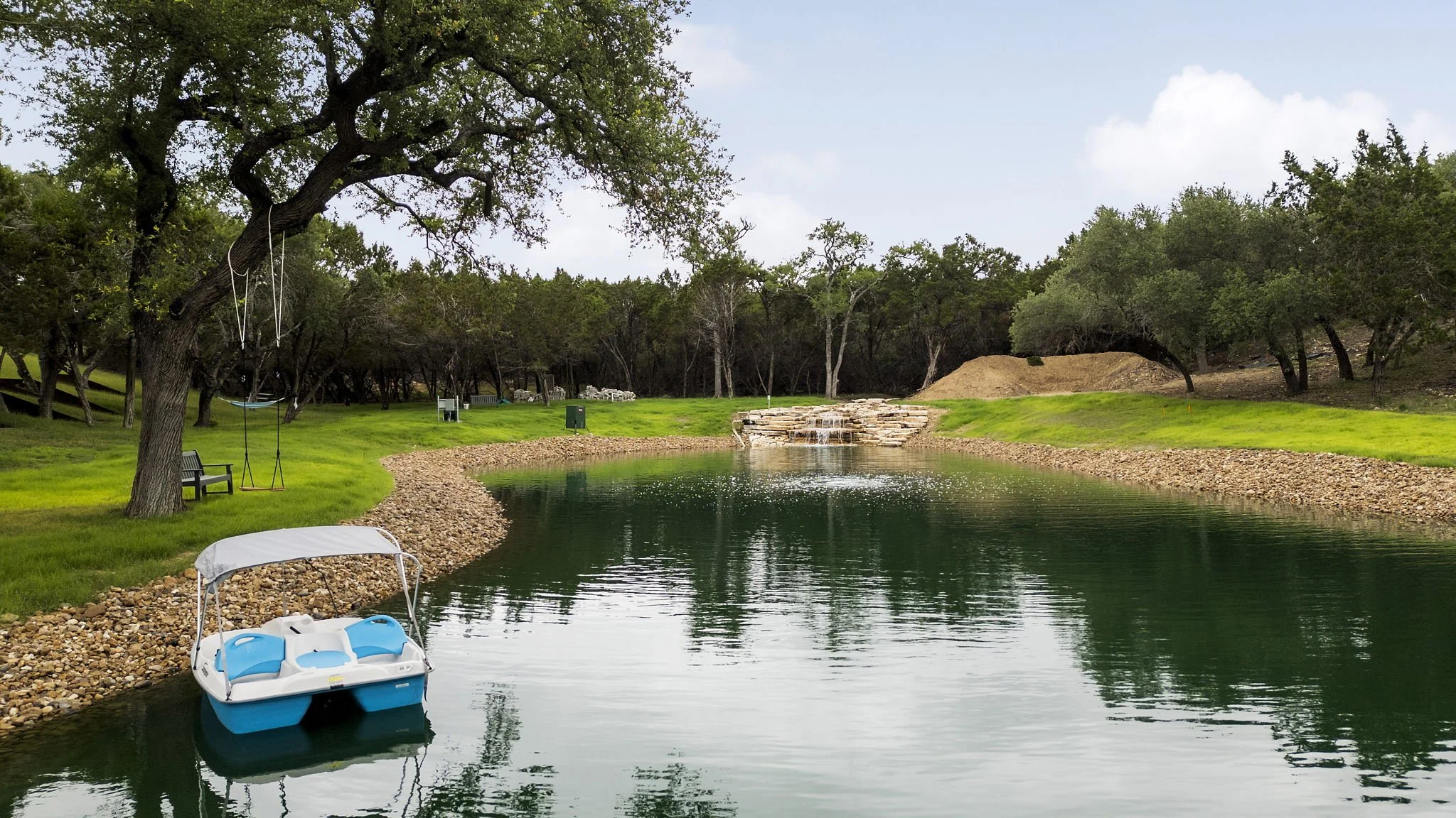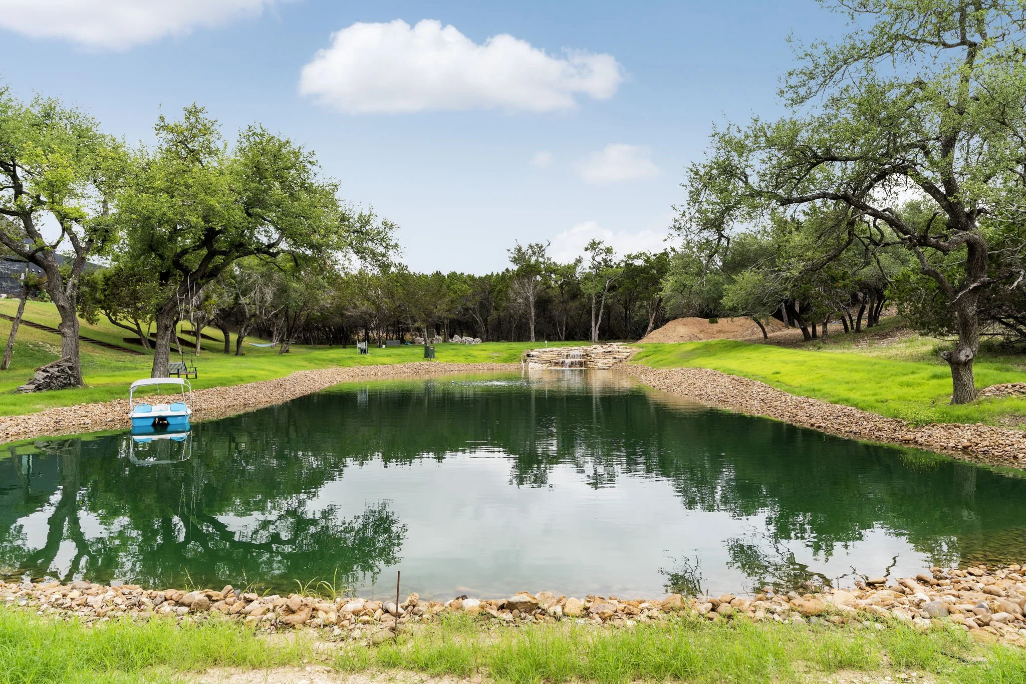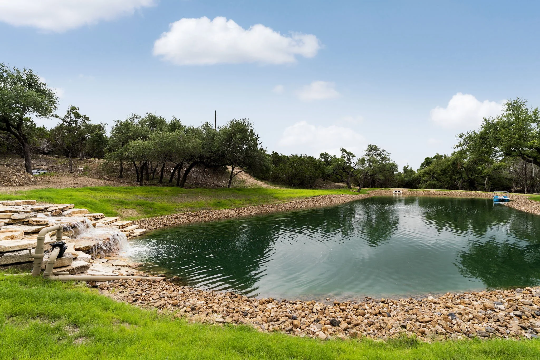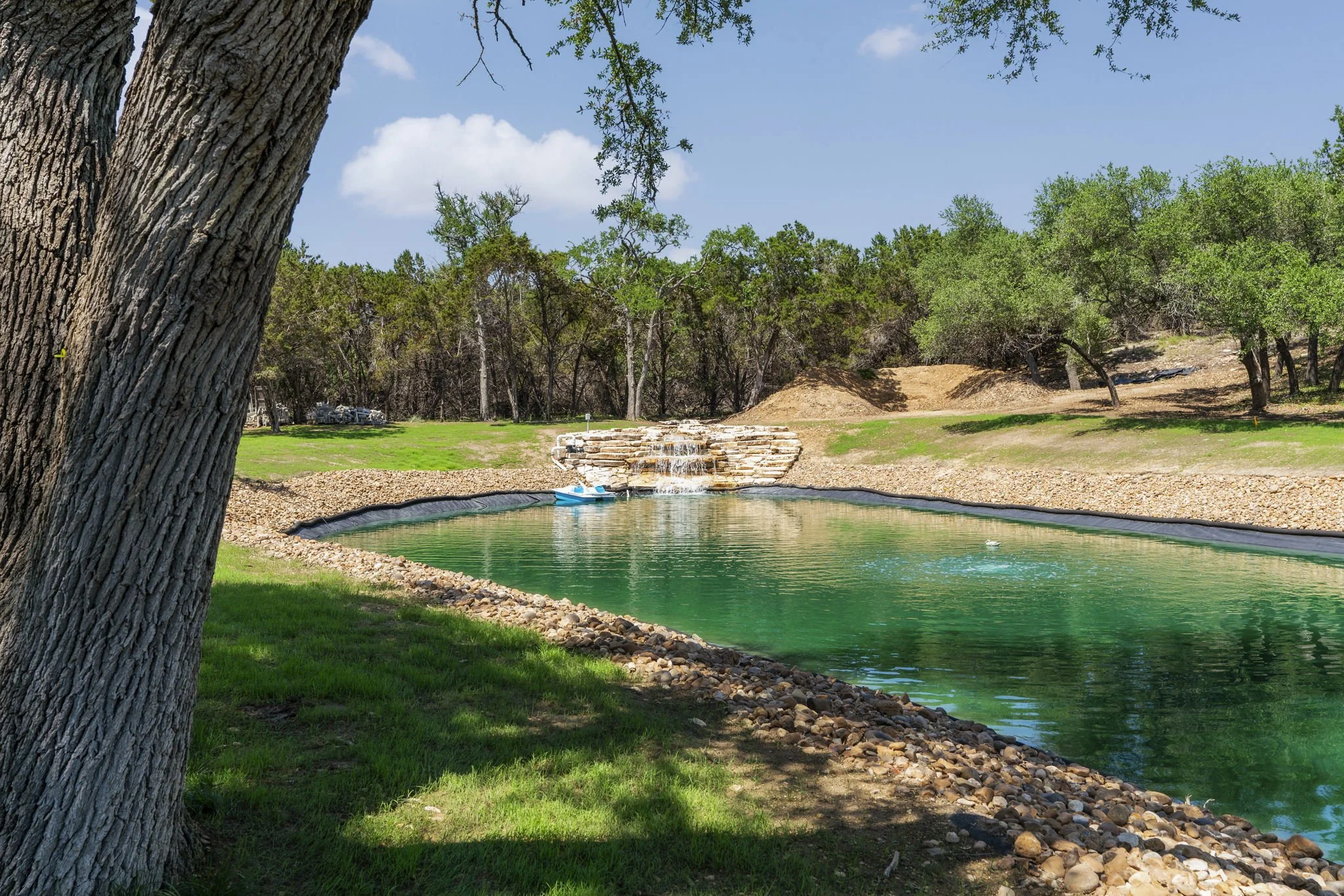1/2 -acre pond with waterfall, autofeeder, aerator, one-piece BTL 30ml Black Aqua Armor liner, artificial structures for fish (stocked with Large Mouth Bass, blue gill, red ear sunfish, and minnows)