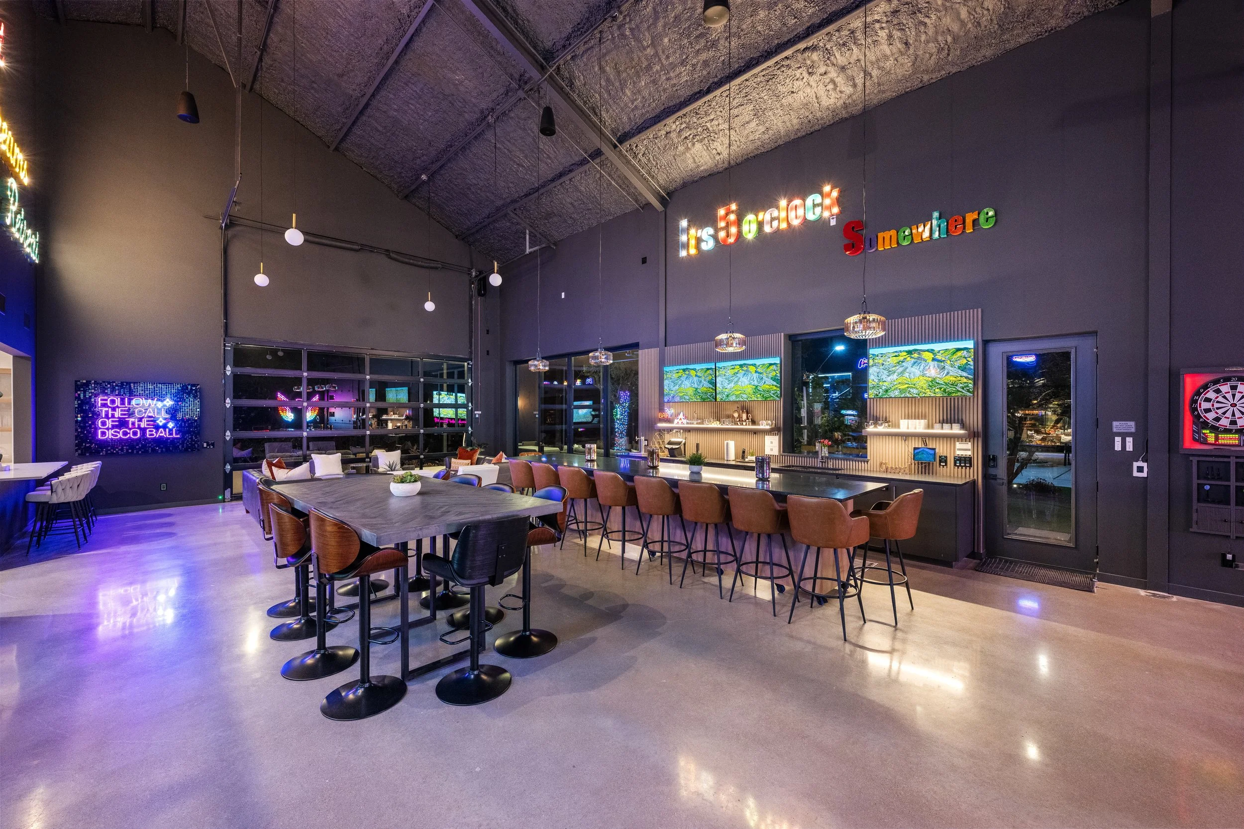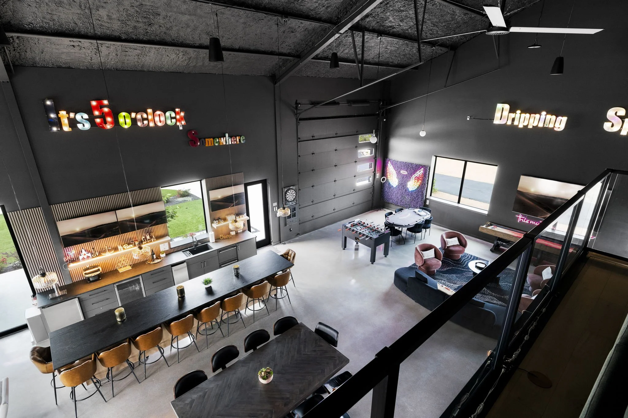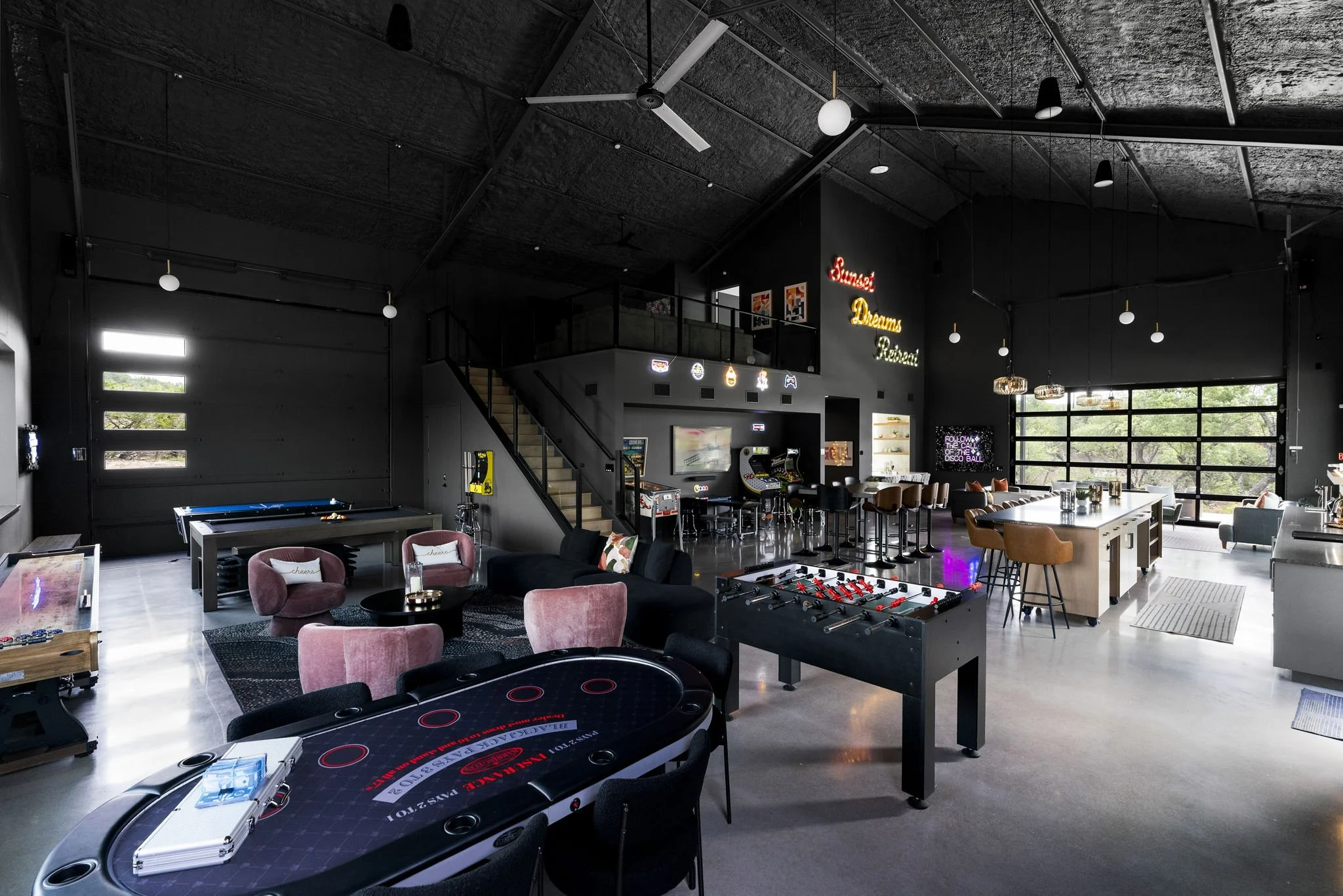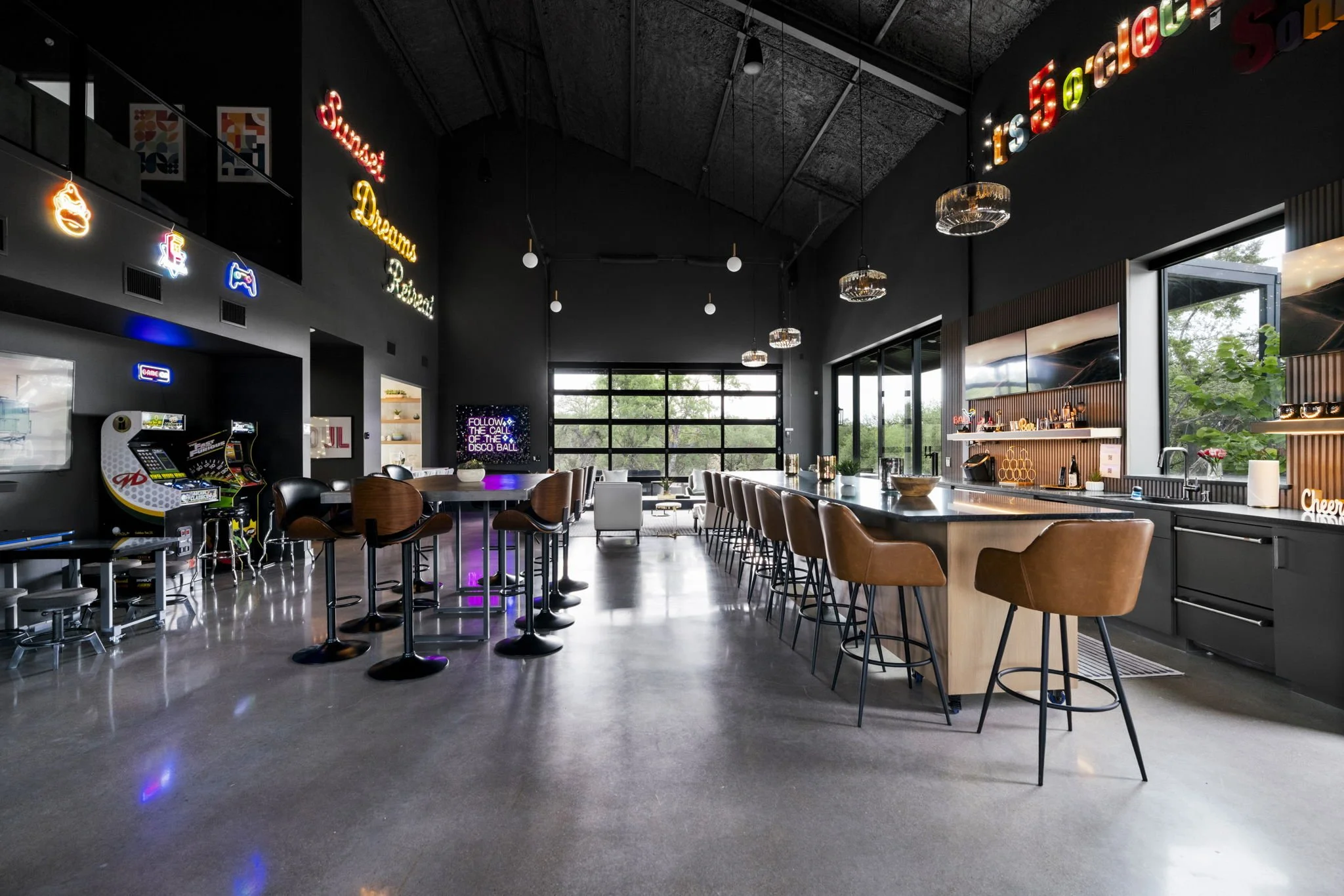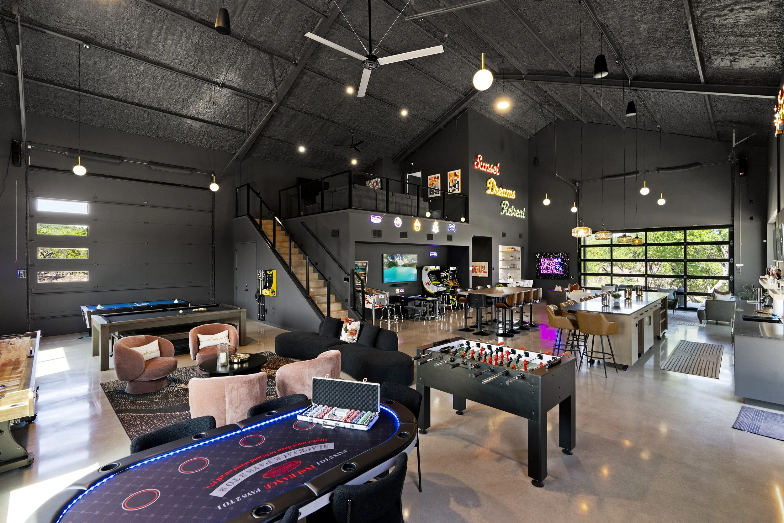 Welcome to the party barn & event hall, steps away from the Main Home. This entertainment space is 2,800 sqft, including a full kitchen, bar, island (on wheels), space for arcade games, lounge, and massive garage capacity.