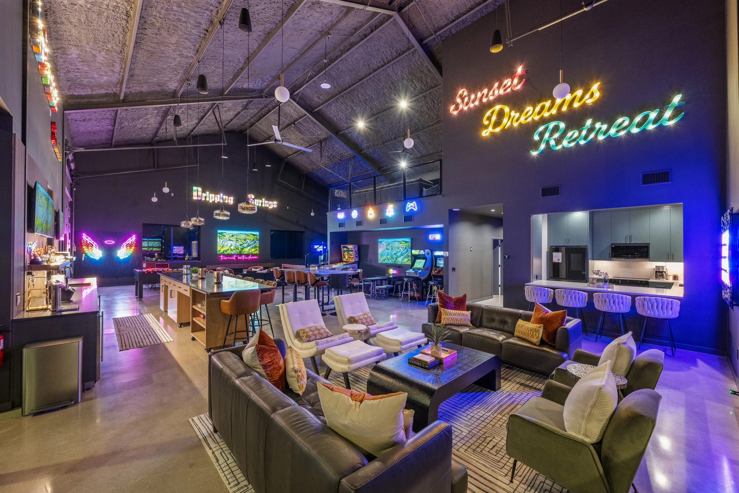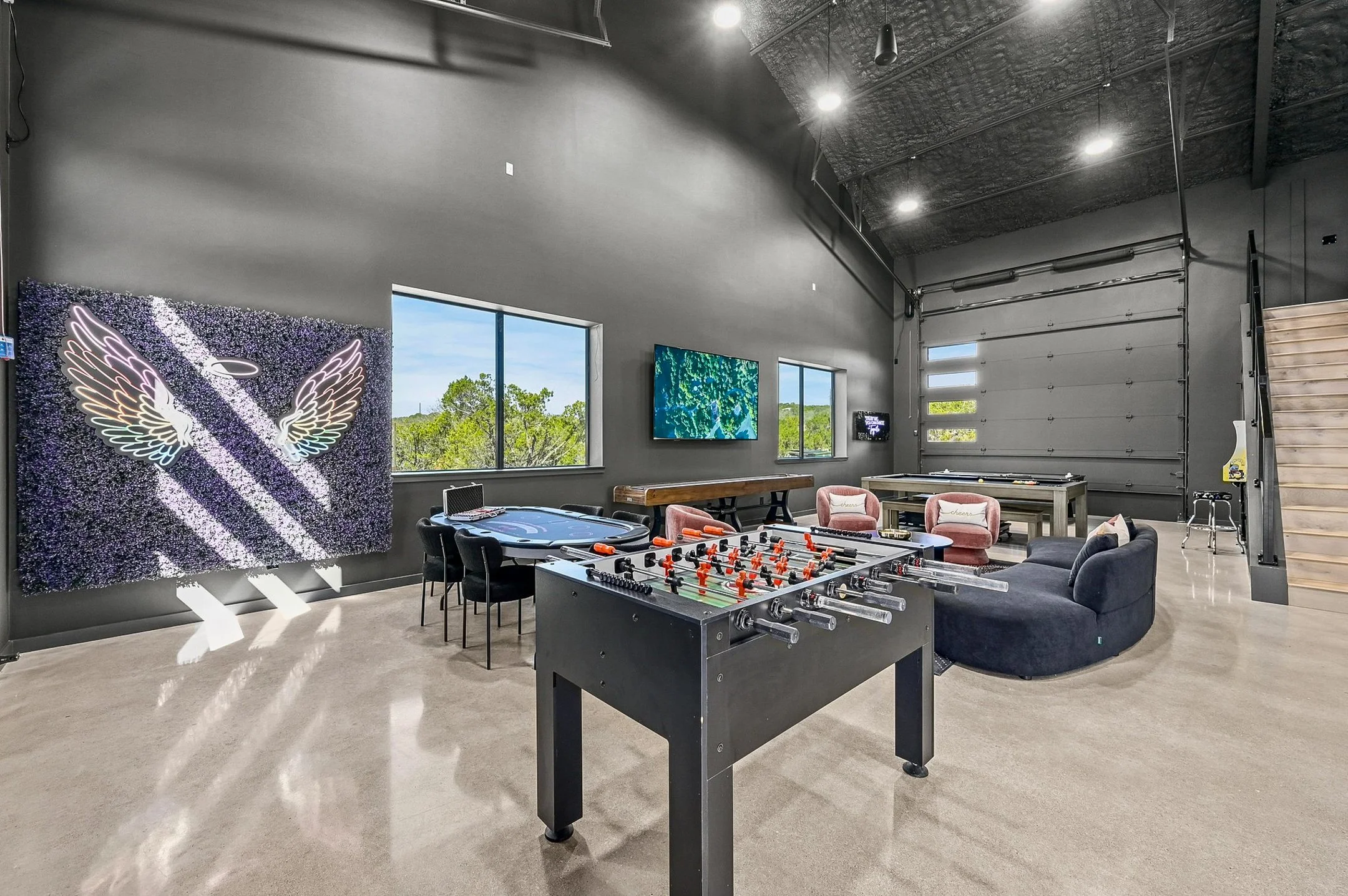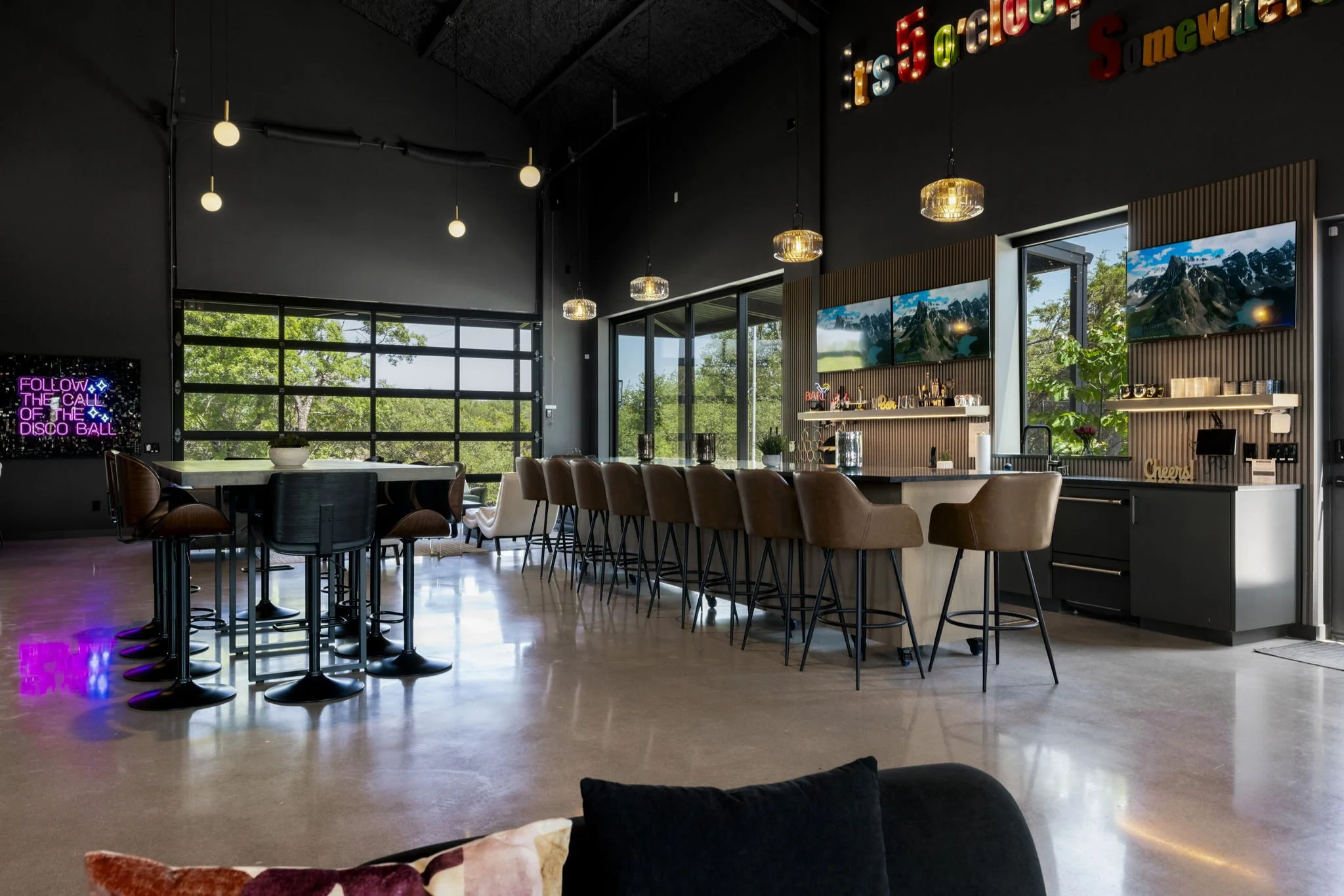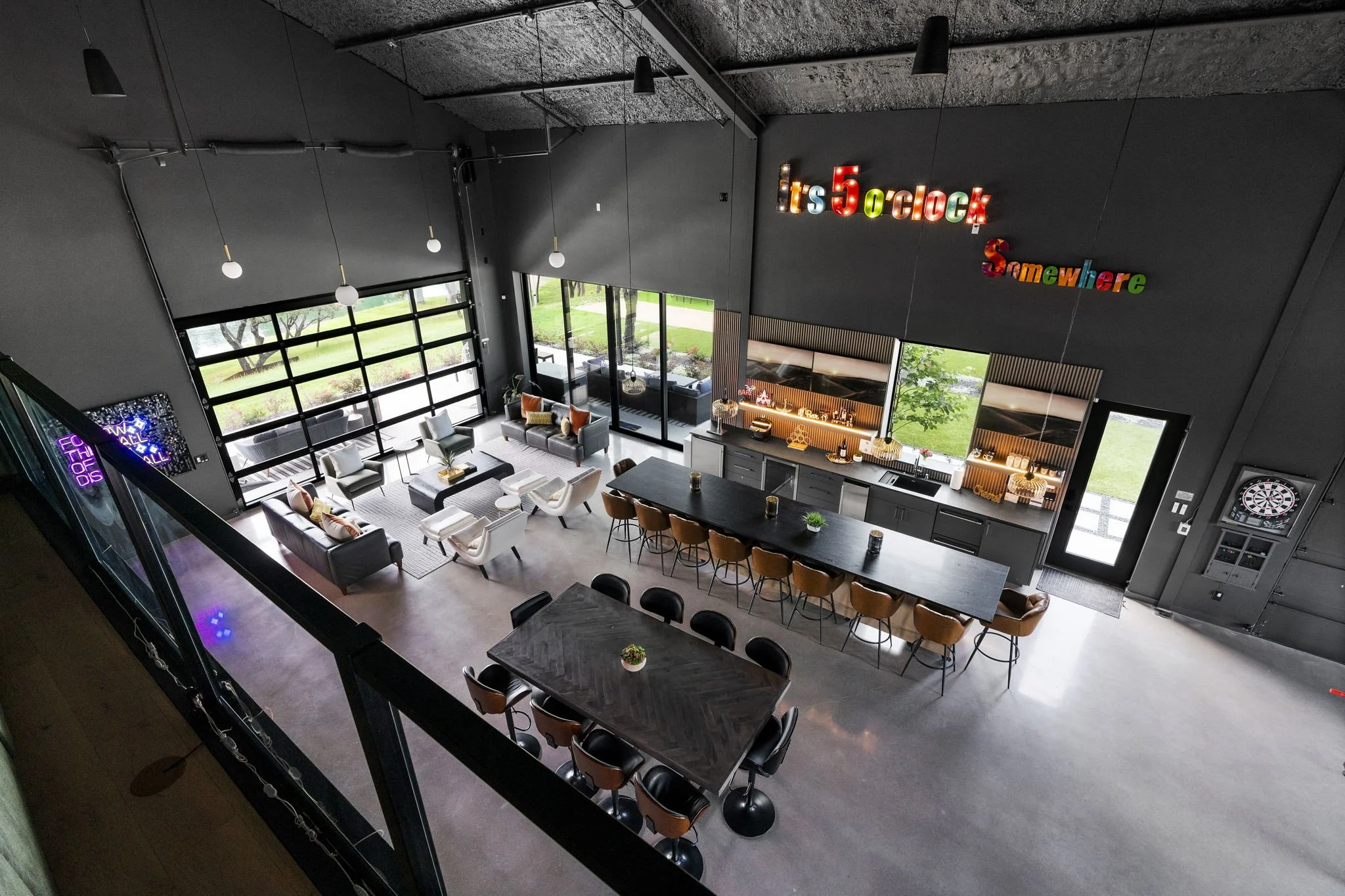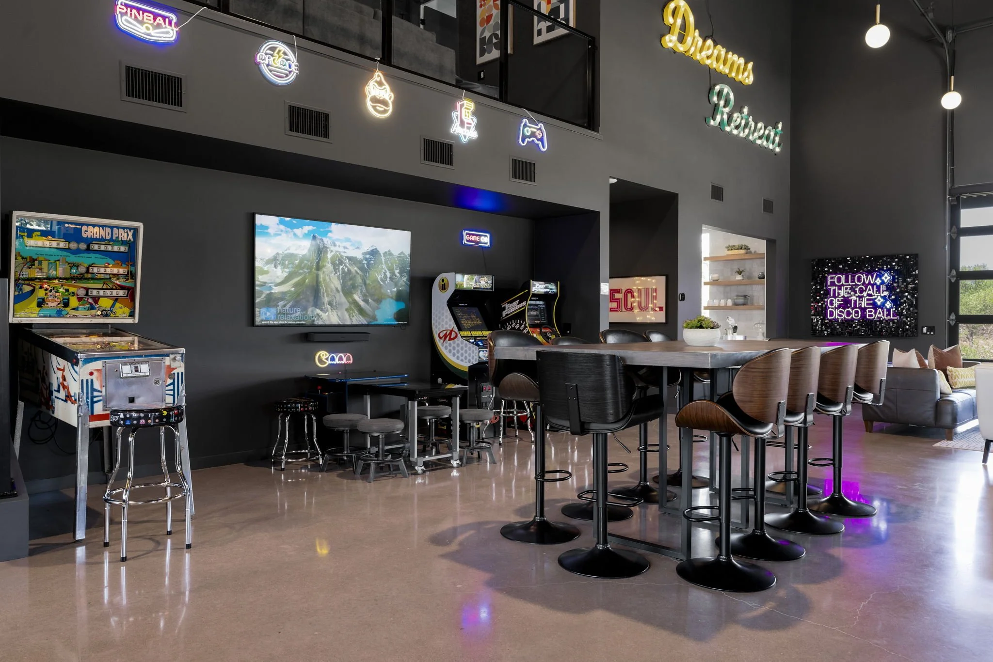 Welcome to the party barn & event hall, steps away from the Main Home. This entertainment space is 2,800 sqft, including a full kitchen, bar, island (on wheels), space for arcade games, lounge, and massive garage capacity.