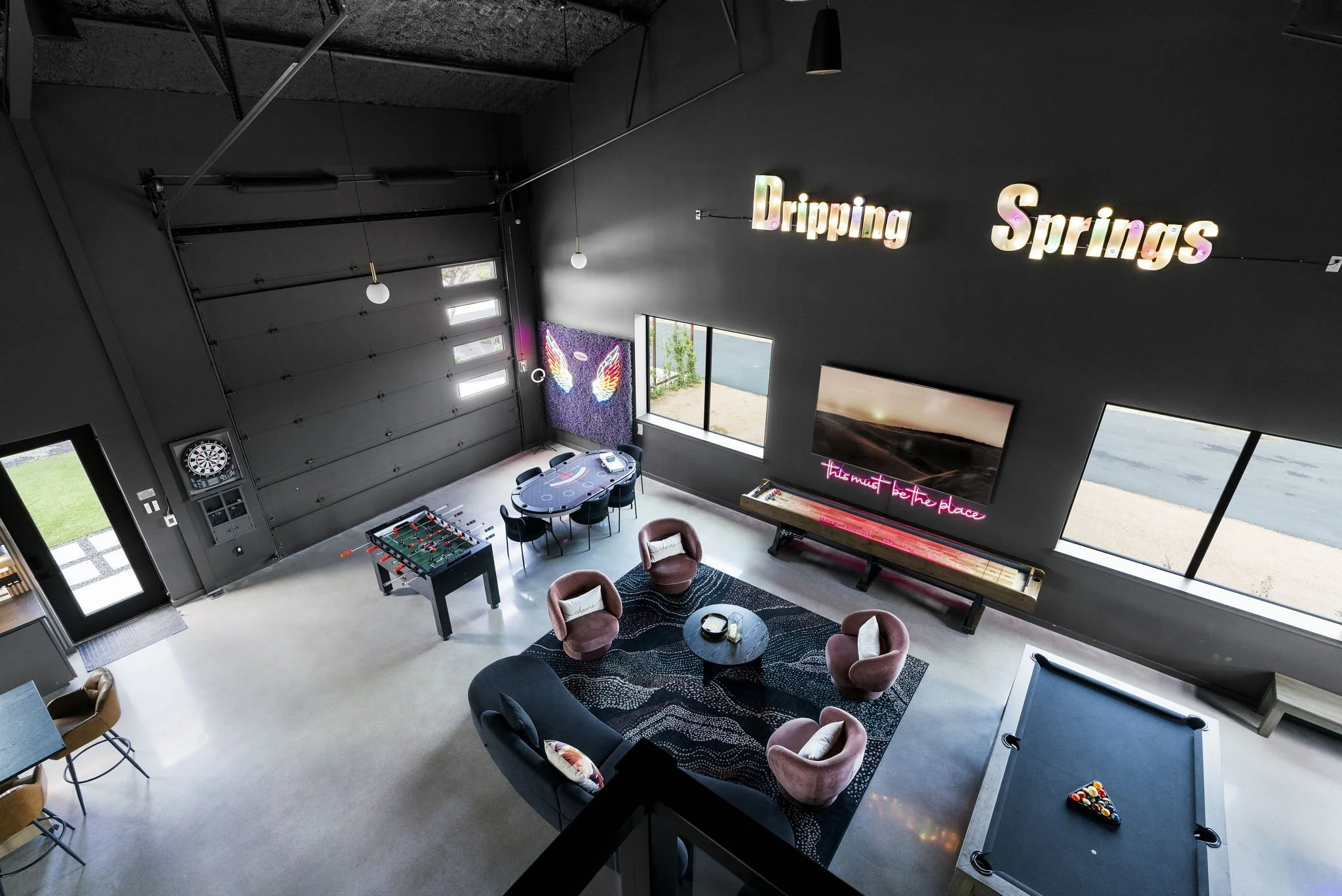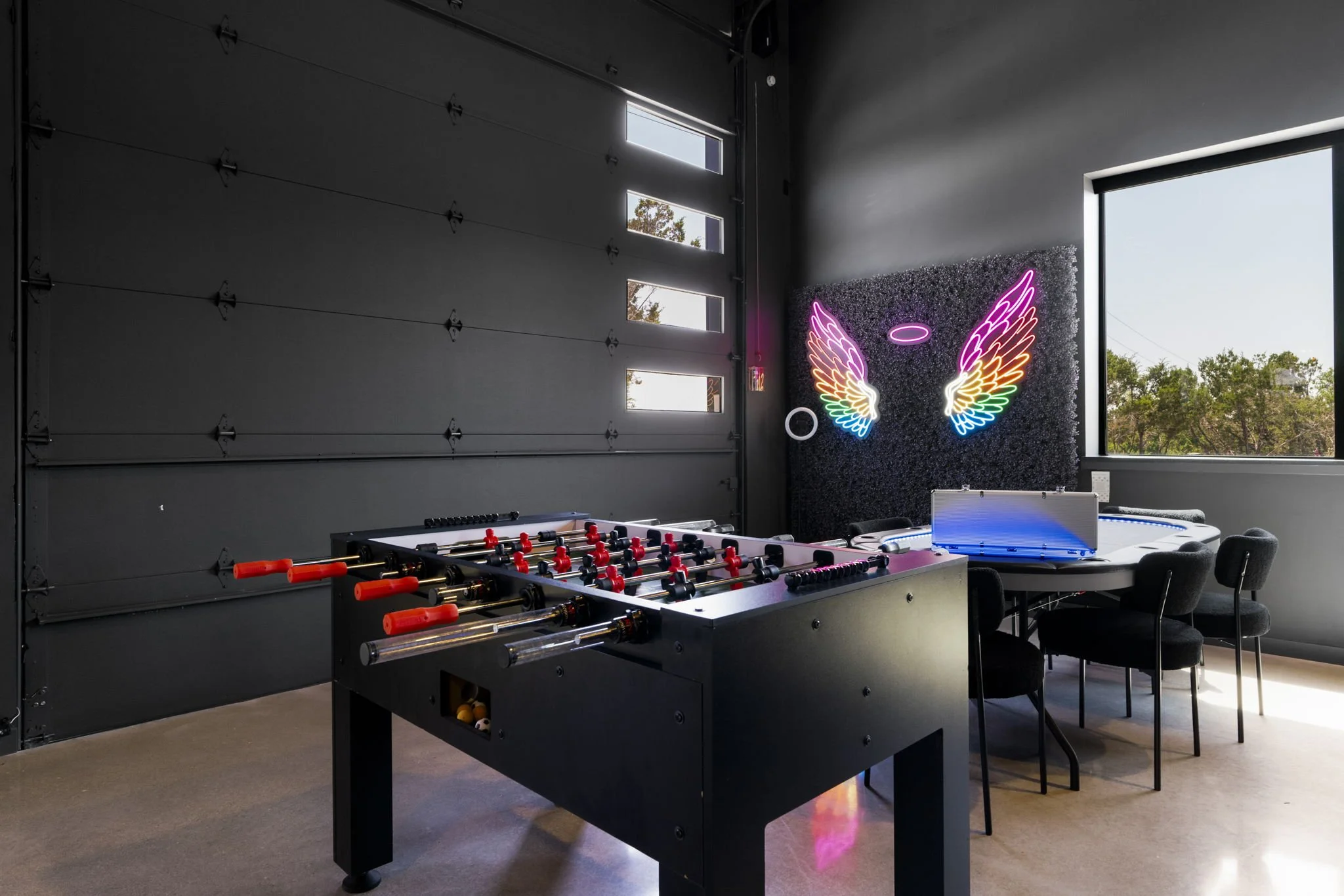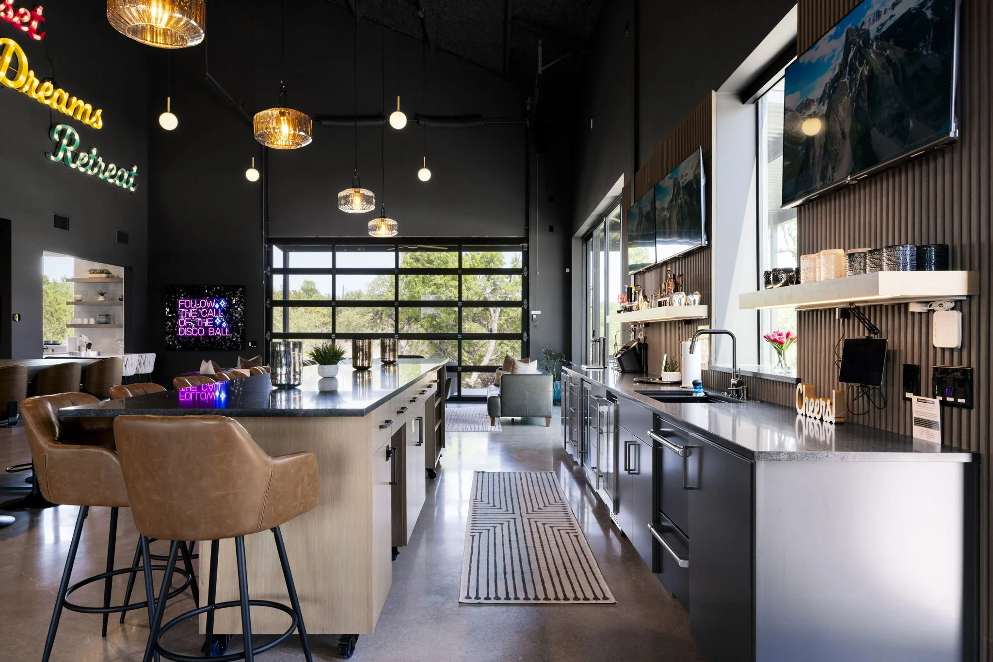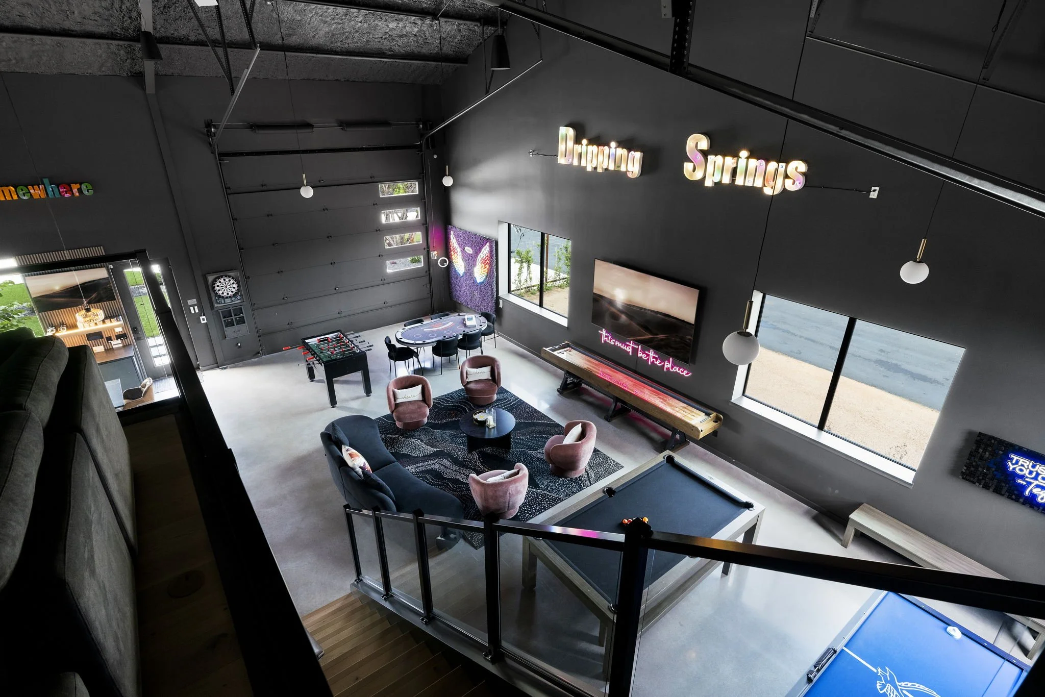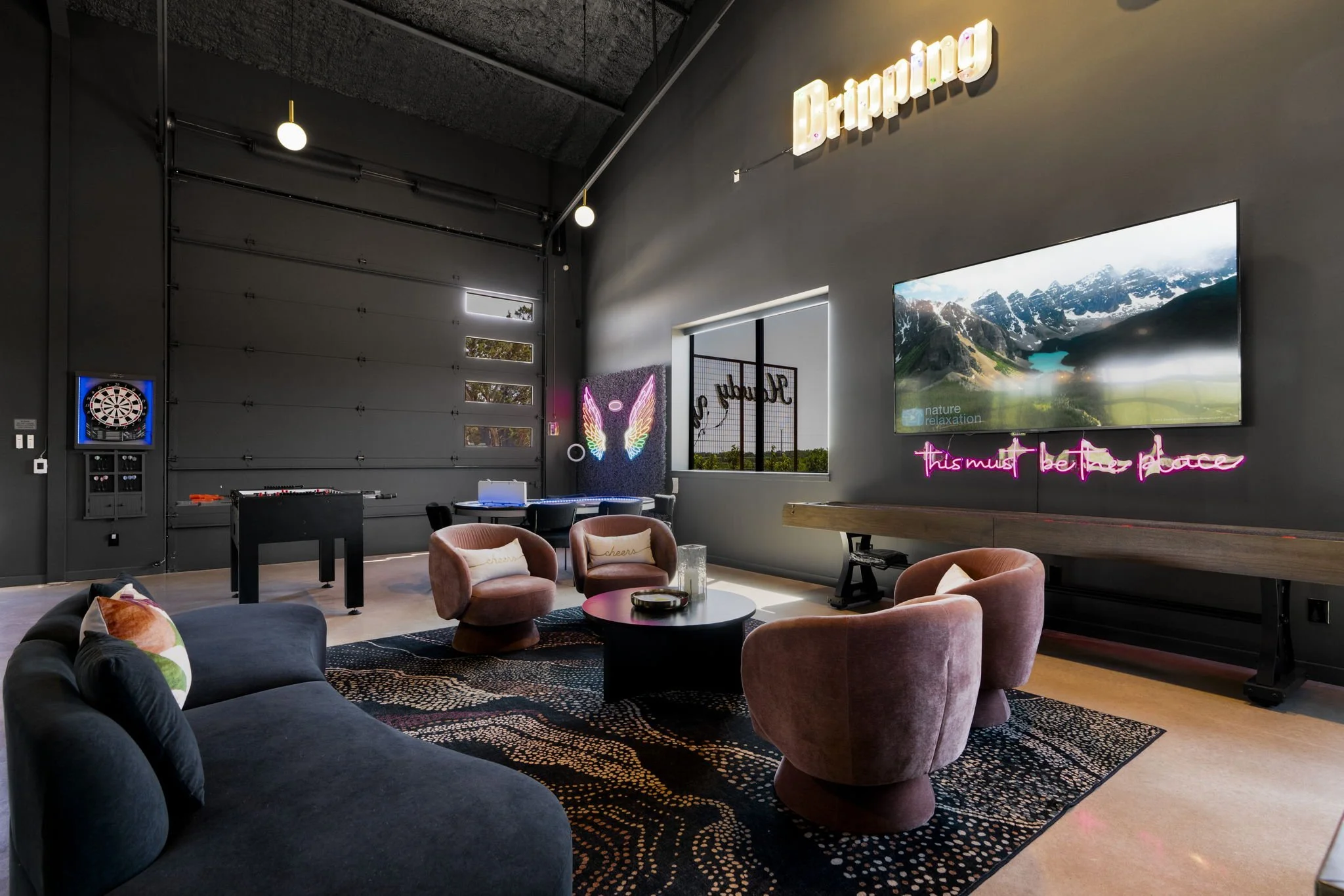 Welcome to the party barn & event hall, steps away from the Main Home. This entertainment space is 2,800 sqft, including a full kitchen, bar, island (on wheels), space for arcade games, lounge, and massive garage capacity.