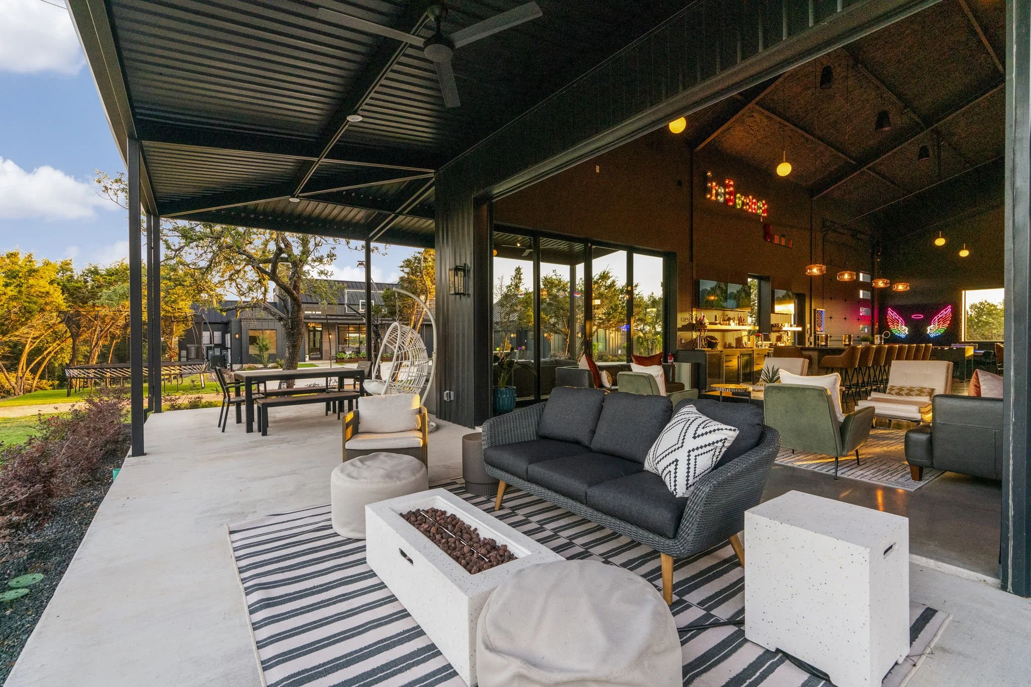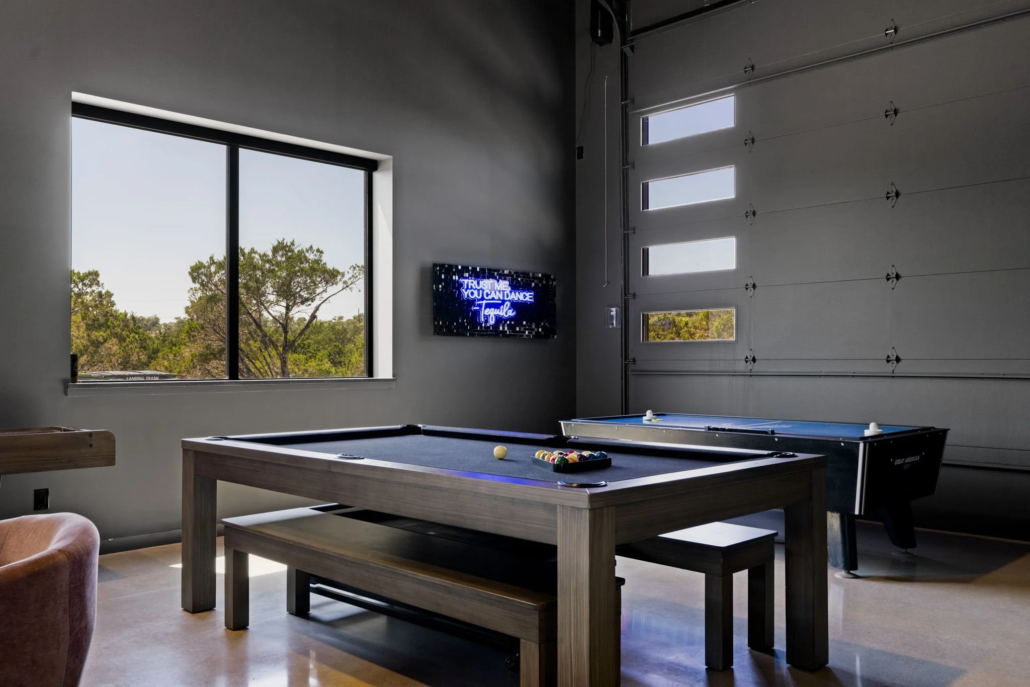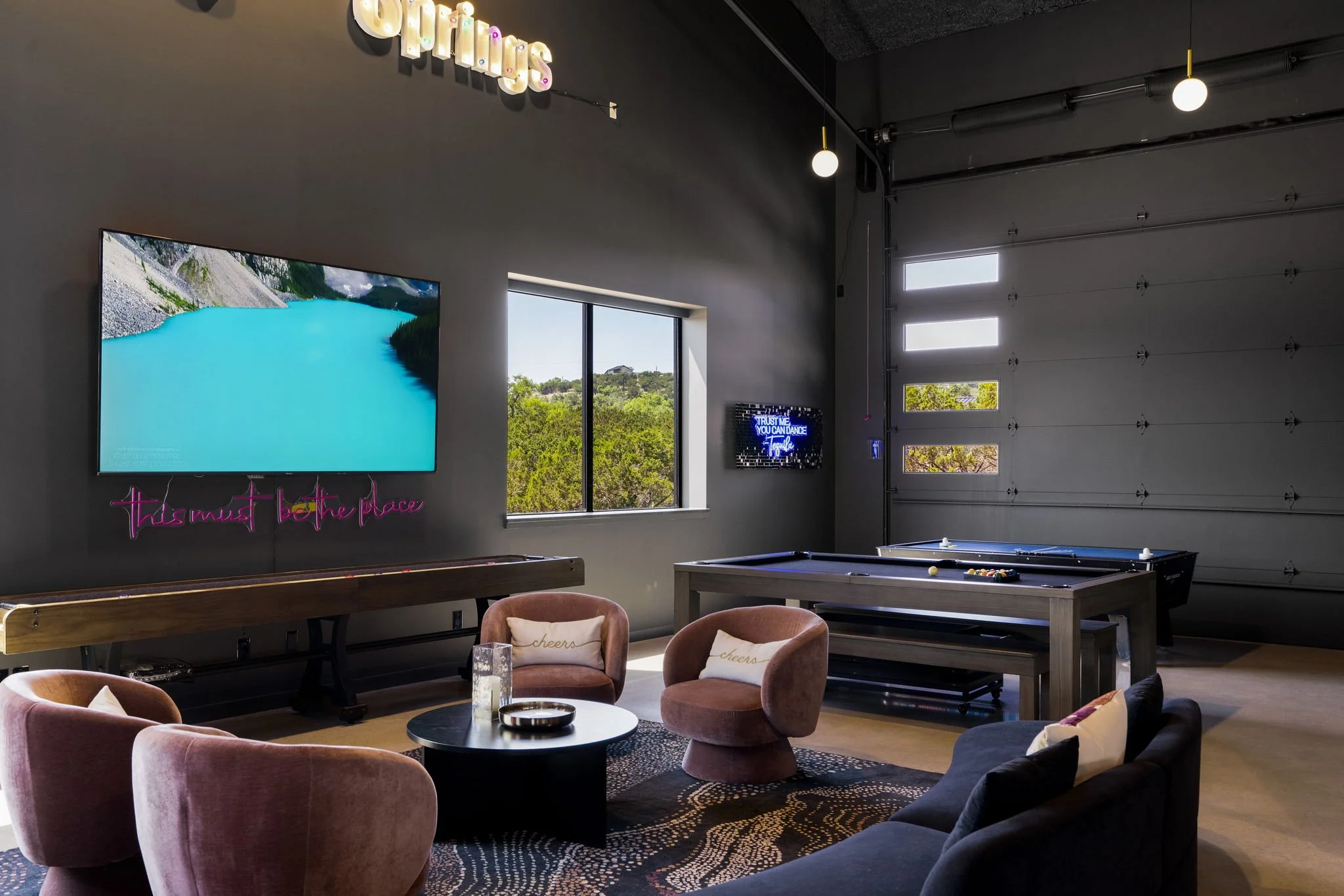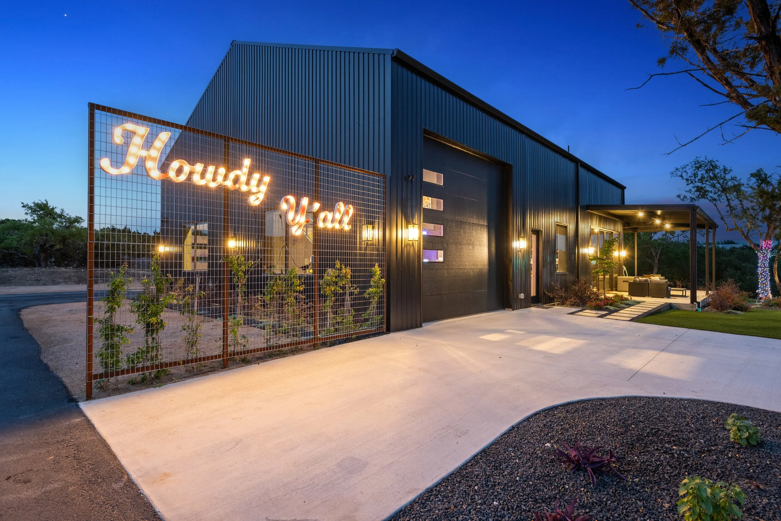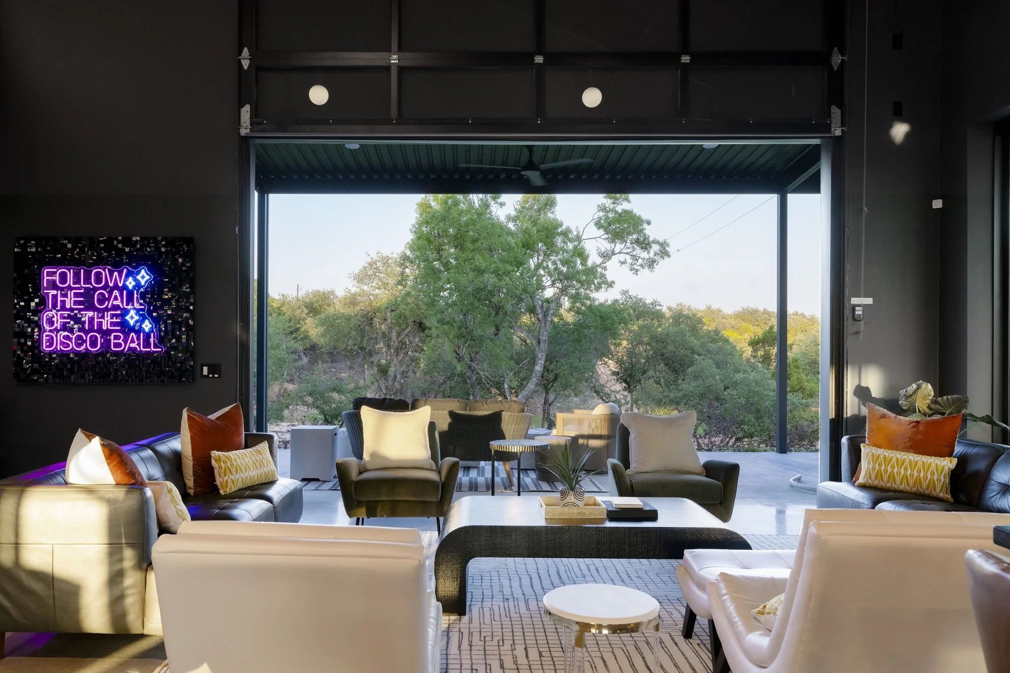 Welcome to the party barn & event hall, steps away from the Main Home. This entertainment space is 2,800 sqft, including a full kitchen, bar, island (on wheels), space for arcade games, lounge, and massive garage capacity.