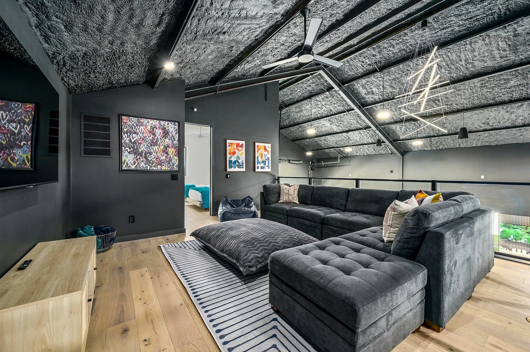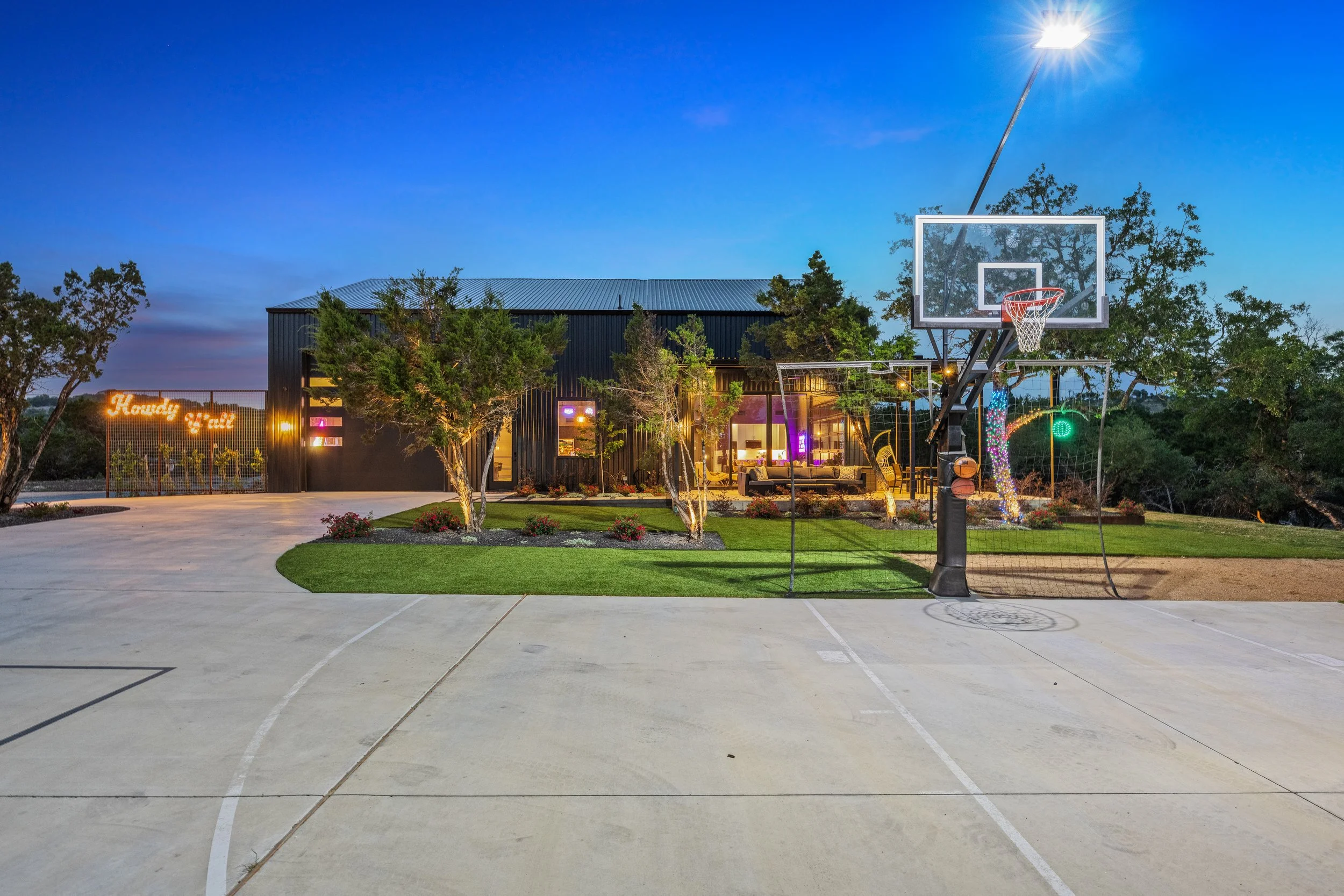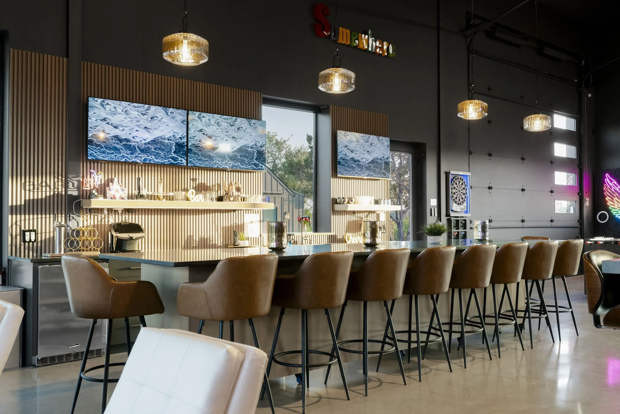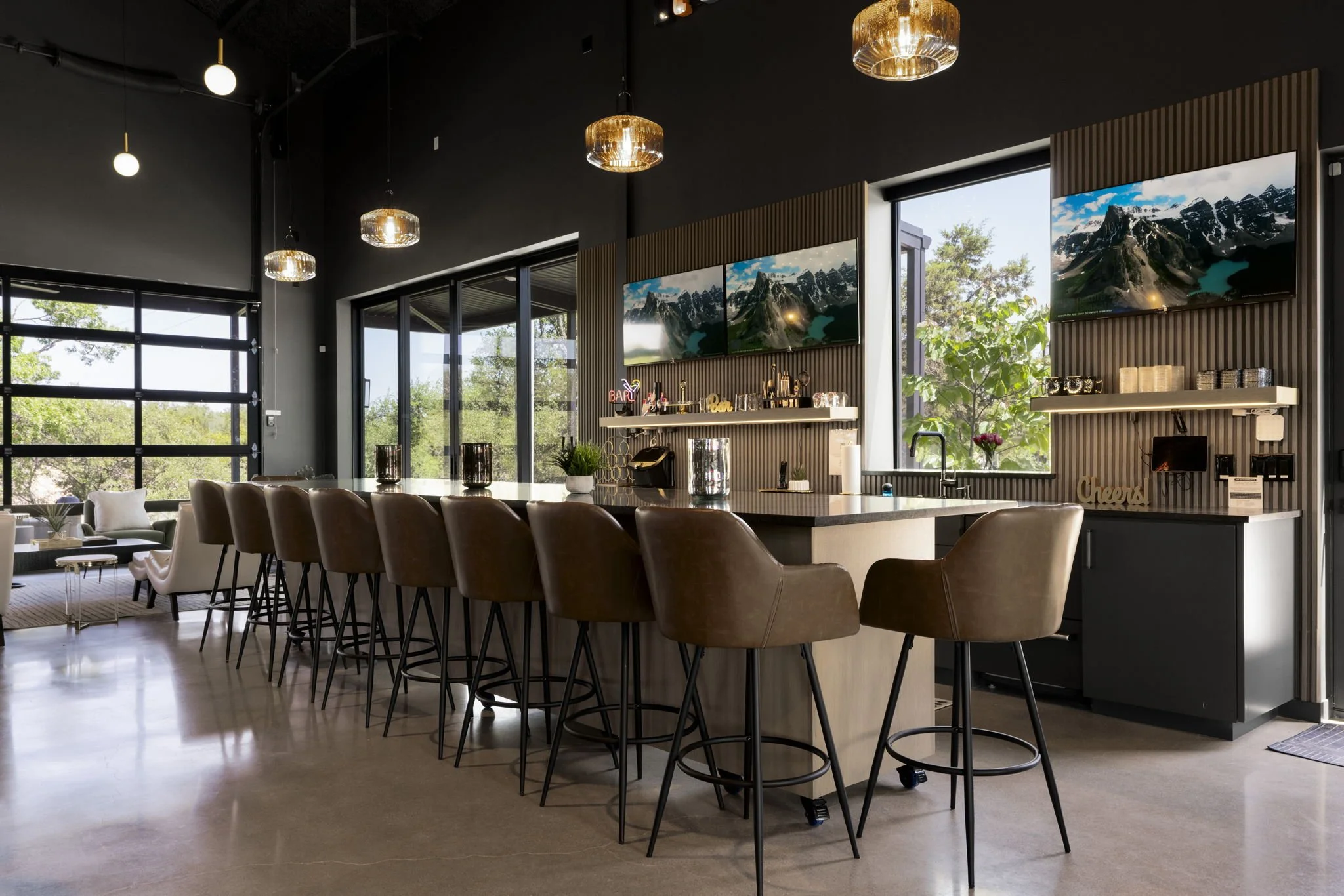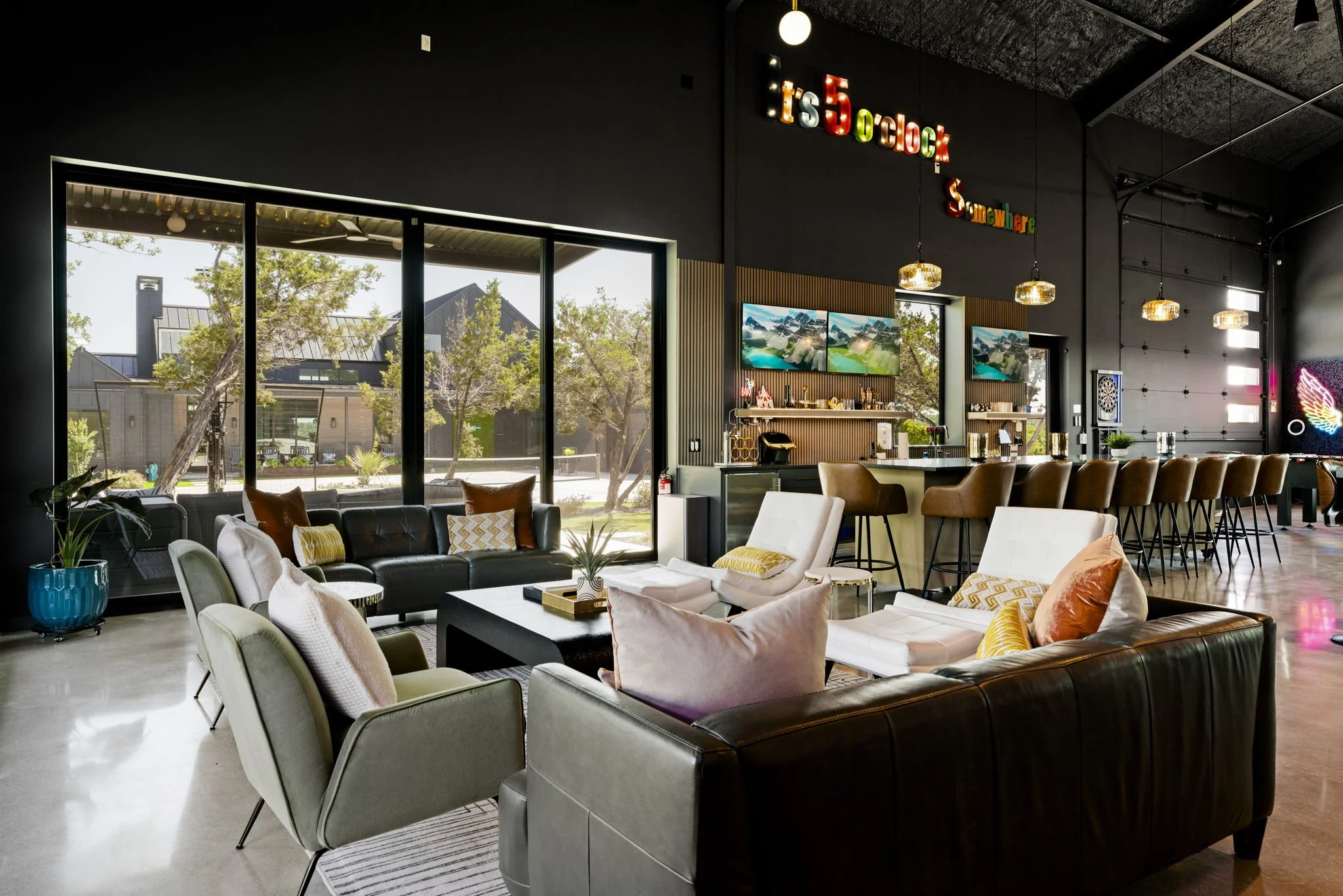 Welcome to the party barn & event hall, steps away from the Main Home. This entertainment space is 2,800 sqft, including a full kitchen, bar, island (on wheels), space for arcade games, lounge, and massive garage capacity.