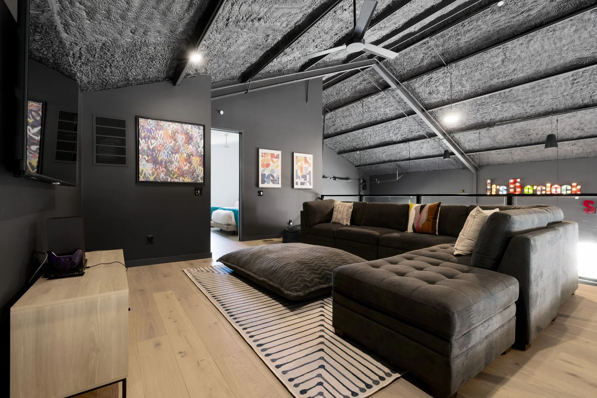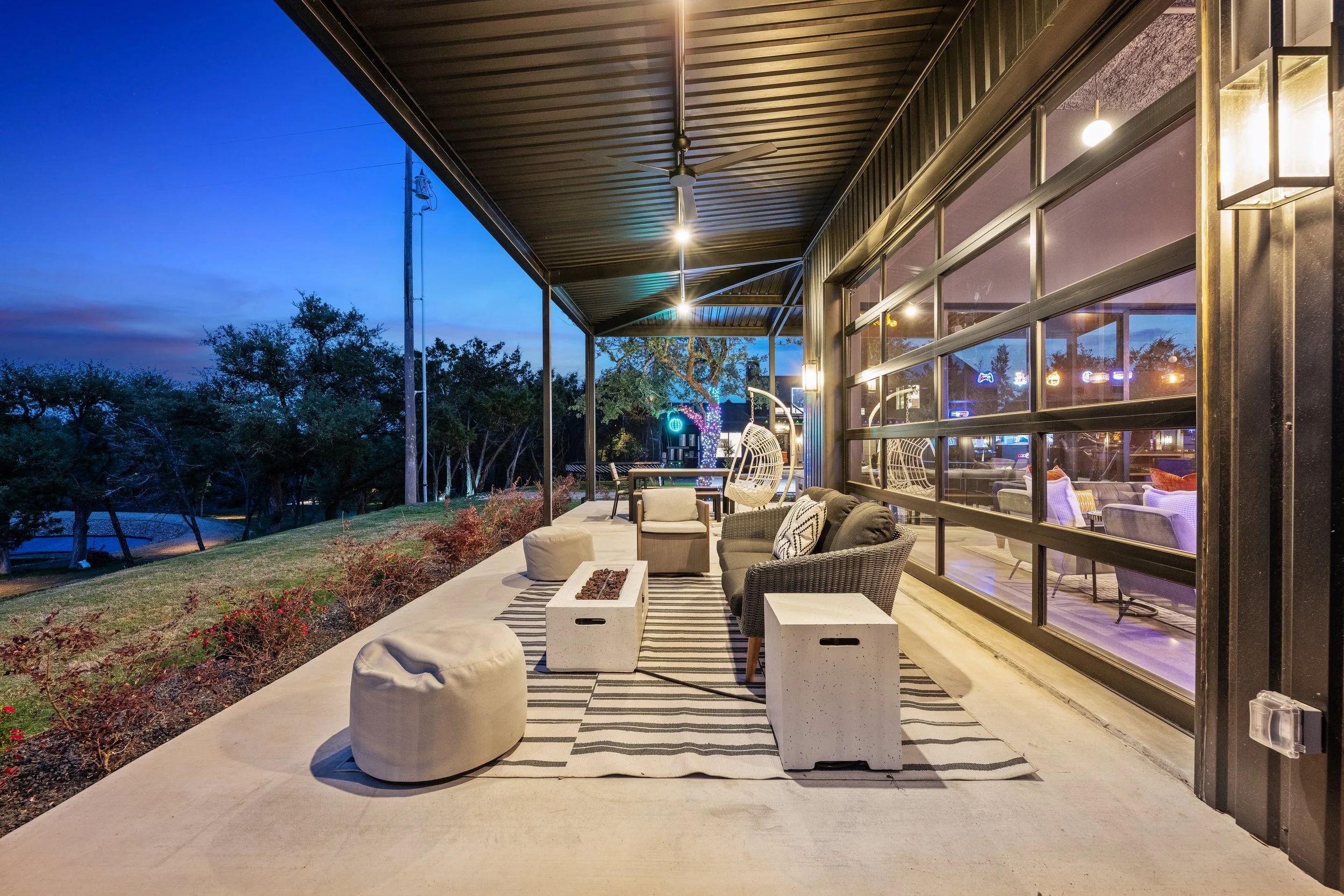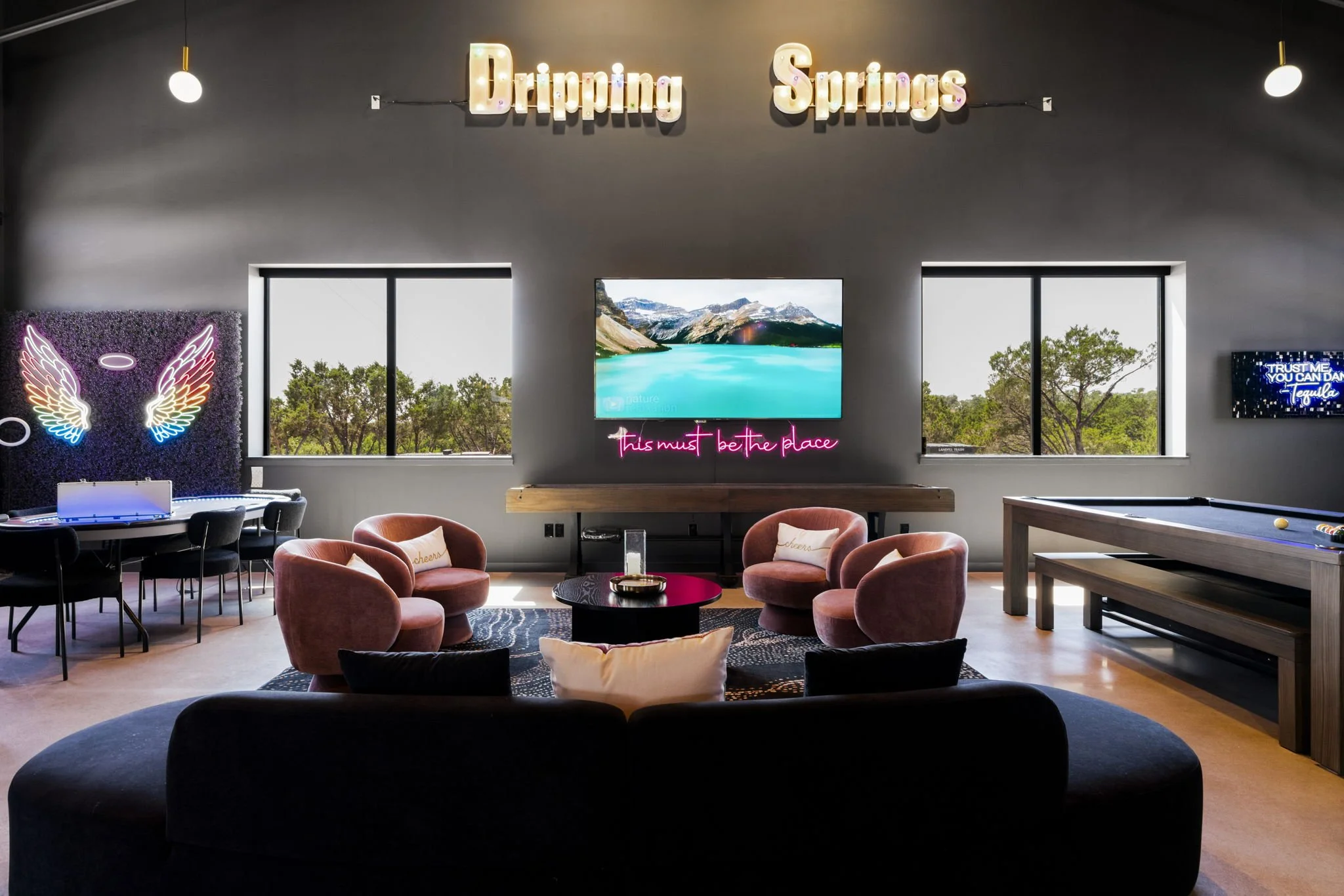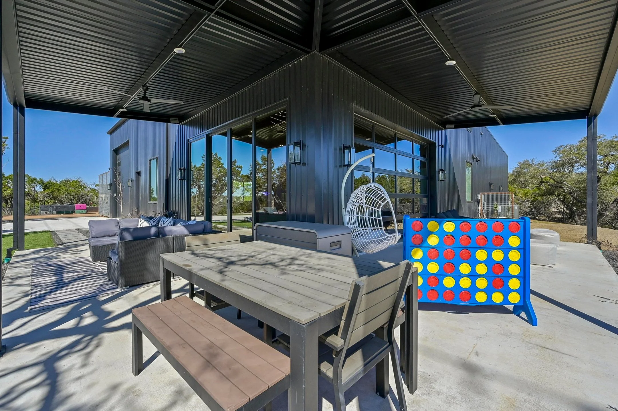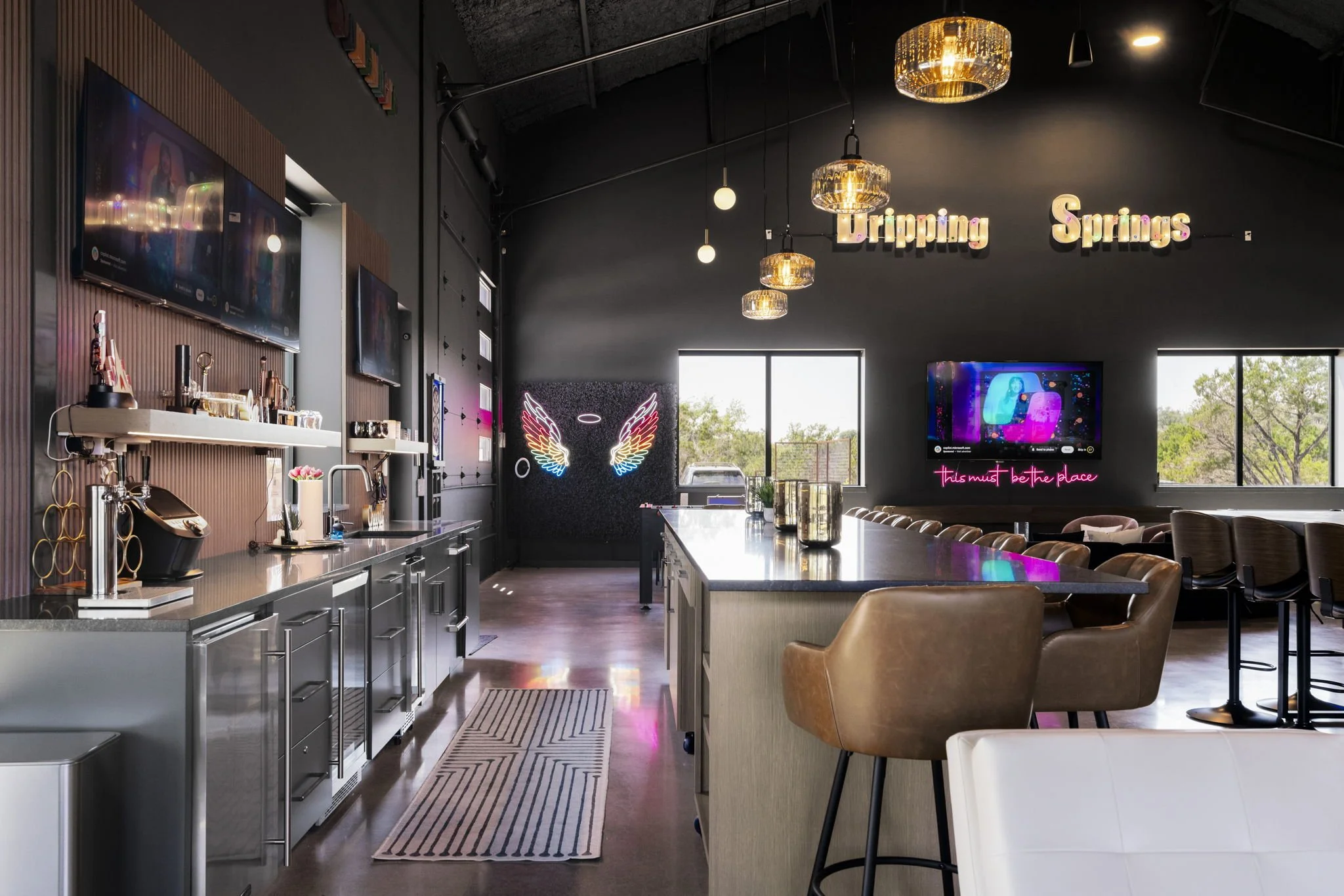 Welcome to the party barn & event hall, steps away from the Main Home. This entertainment space is 2,800 sqft, including a full kitchen, bar, island (on wheels), space for arcade games, lounge, and massive garage capacity.