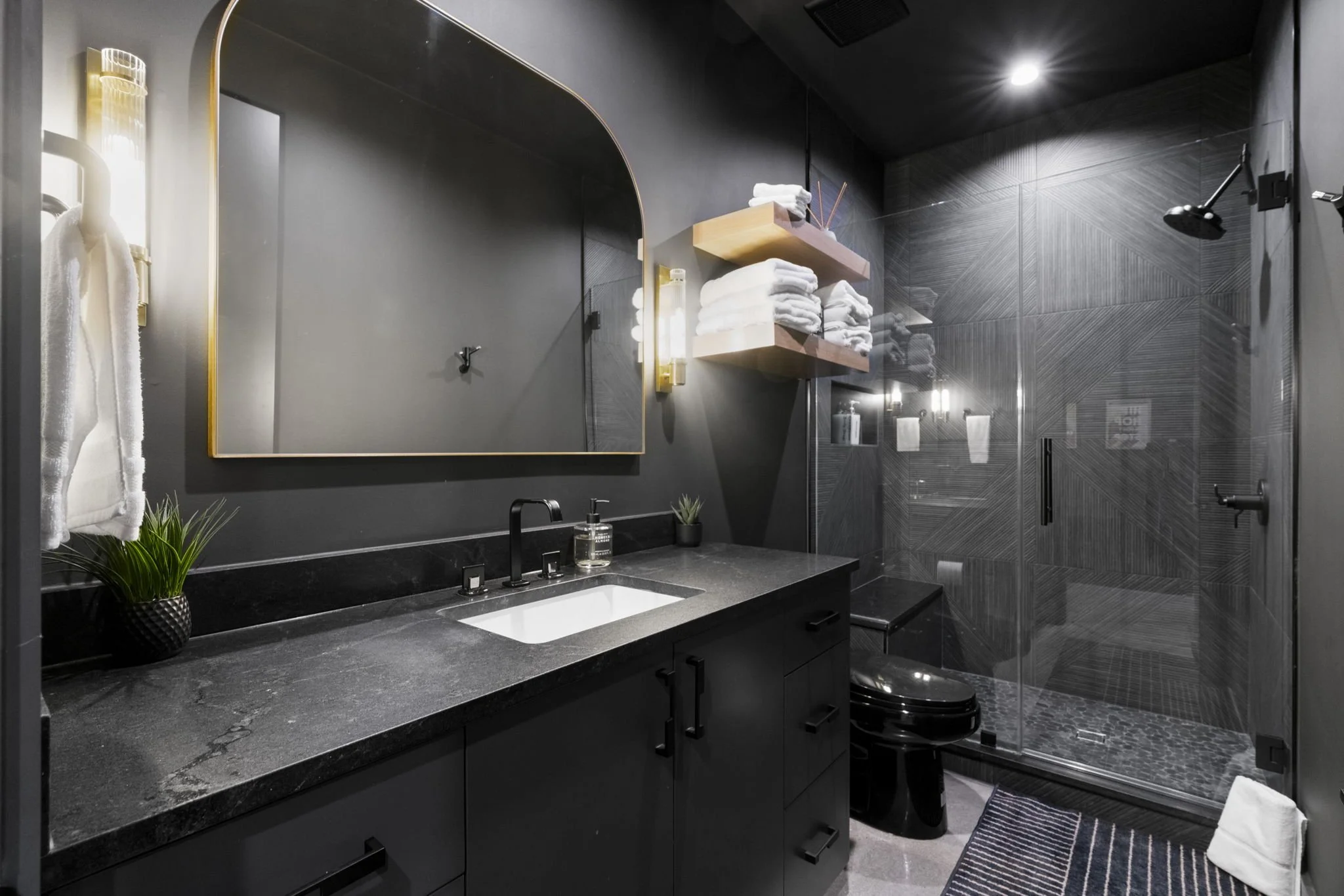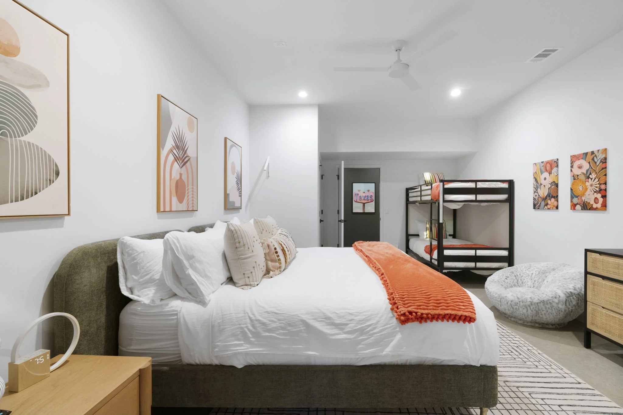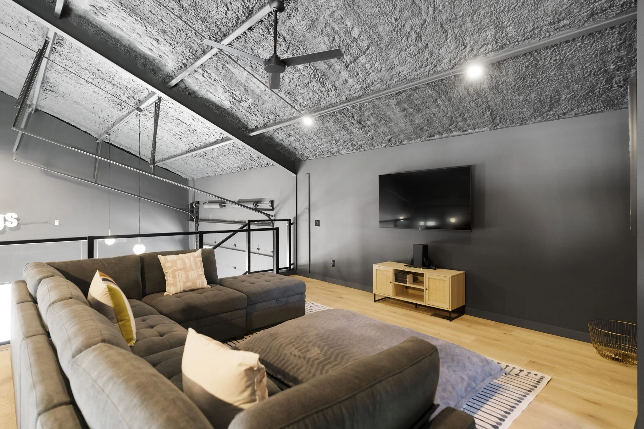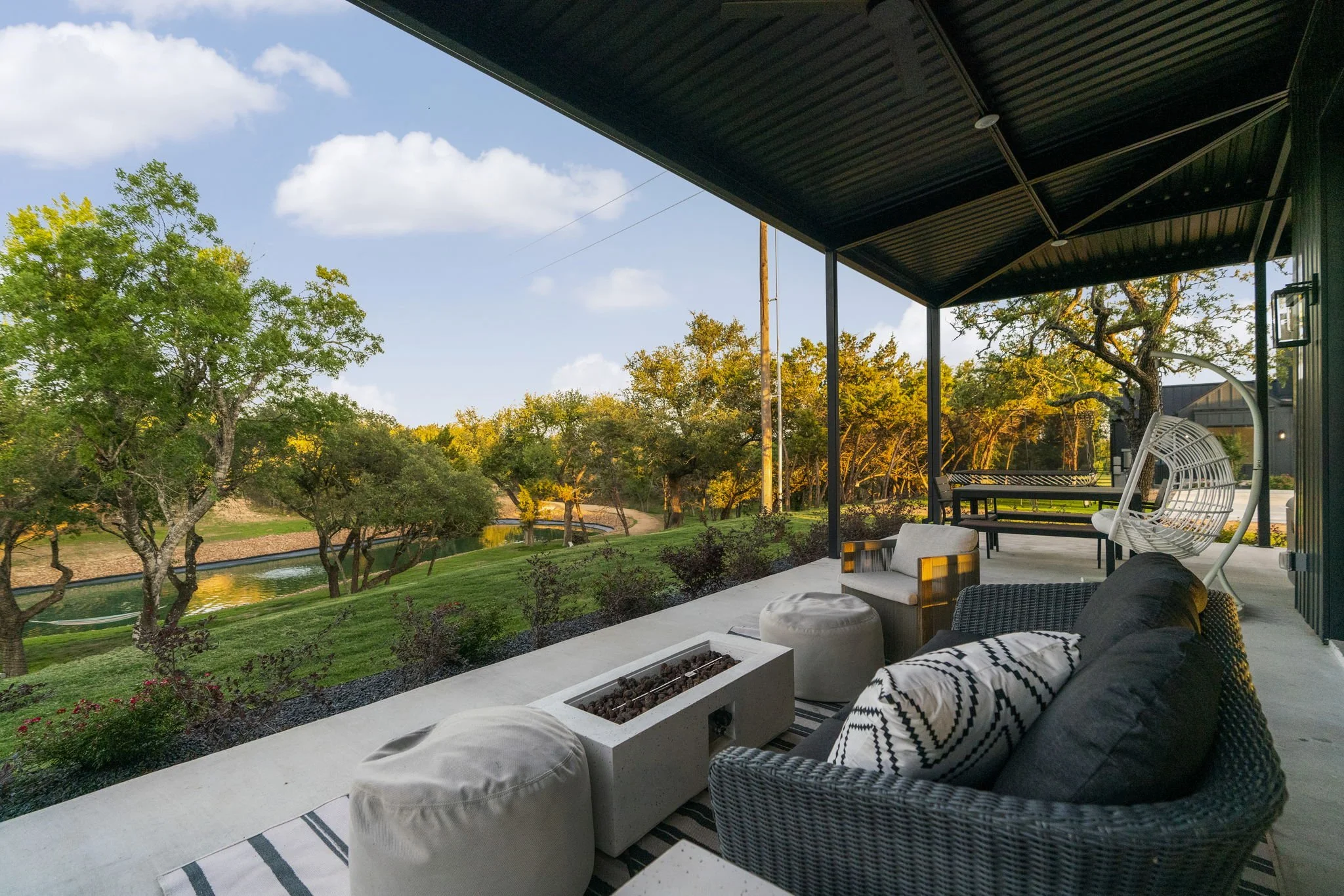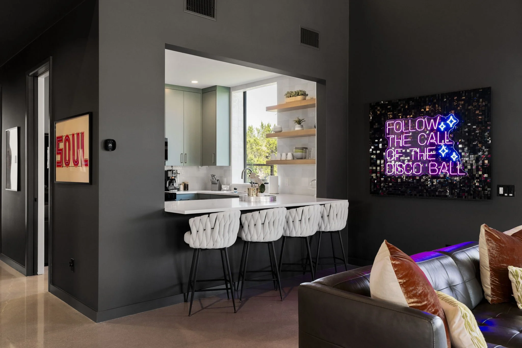 Welcome to the party barn & event hall, steps away from the Main Home. This entertainment space is 2,800 sqft, including a full kitchen, bar, island (on wheels), space for arcade games, lounge, and massive garage capacity.